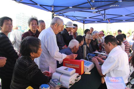 活動(dòng)開(kāi)始后,大量的市民又陸續(xù)來(lái)到活動(dòng)現(xiàn)場(chǎng)。血壓計(jì)檢測(cè)臺(tái)前已被市民圍的水泄不通。在免費(fèi)驗(yàn)光臺(tái)前,前來(lái)驗(yàn)光的居民排起了長(zhǎng)隊(duì)。工作人員一邊將驗(yàn)光結(jié)果逐一向居民做著講解,一邊向居民介紹用眼護(hù)眼常識(shí)。咨詢(xún)四表檢測(cè)、室內(nèi)空氣質(zhì)量等相關(guān)問(wèn)題的居民也是絡(luò)繹不絕。