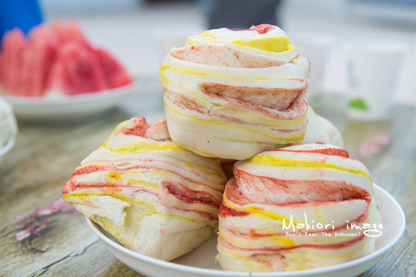 青海的花卷是帶有顏色,一開始我們以為是用食用顏料染成的,一問才知道是用姜黃等其他調(diào)料烹制而成,不僅僅外形上色彩豐富,而且會(huì)帶有咸味。