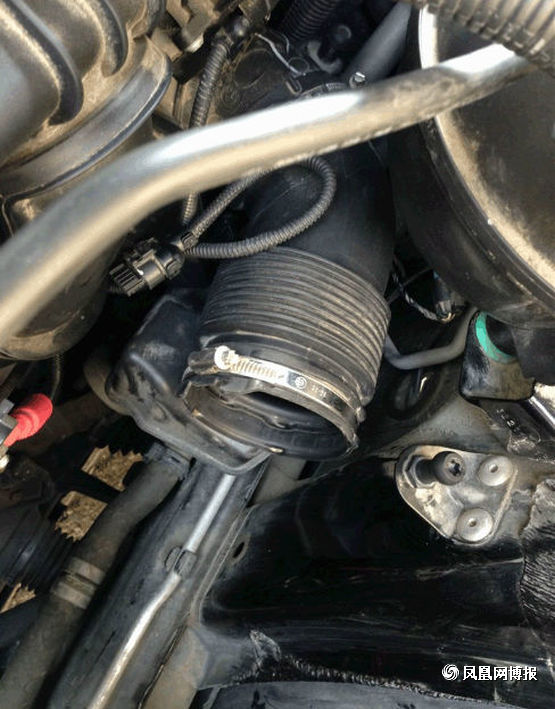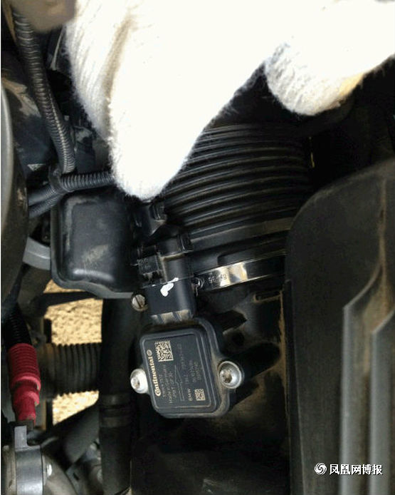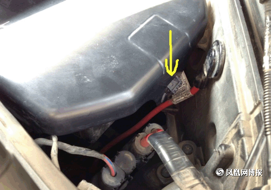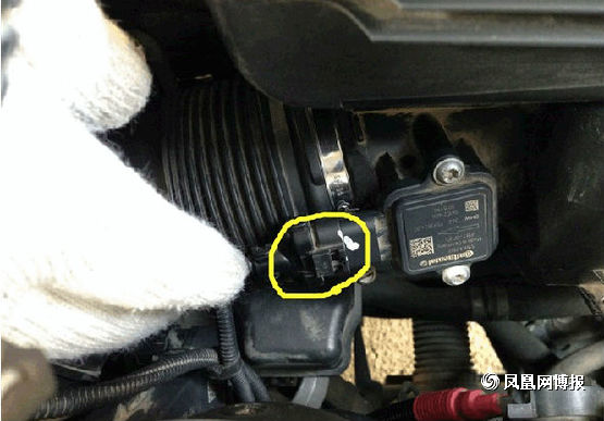 接下來就是要準(zhǔn)備拆下空氣濾芯了,第一次拆的童鞋要注意了,圖中標(biāo)出來的就是連接空氣濾芯的接口,不要像我這樣拽了半天也沒拔出來,原來這上面有個小機(jī)關(guān),有個凸起的小開關(guān)左手往下按的同時右手往后面拉,它就出來了。(另外,告訴大家,在經(jīng)過行駛后停車的拆裝的童鞋要等車子發(fā)動機(jī)冷卻后再動手,不讓帶了手套,你還是會覺得旁邊的發(fā)動機(jī)很燙,會不小心被燙到。)